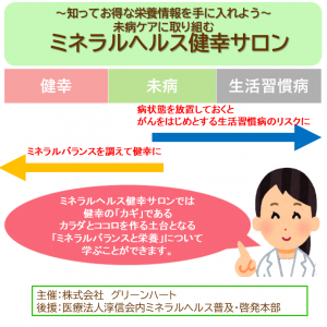 ホリスティキュア栄養ケアスタンドでは、医師らが過去の研究成果を基に構築した個別・最適性の食育メソッド【未病ケア「ミネラルヘルス®」】を活用した食事アドバイスを、食育のプロであるミネラルヘルスコーチ「プロ」有資格者が行っています。ミネラルヘルス健幸サロンでは、そのミネラルヘルスコーチ「プロ」がセミナー講師を担当し、健幸に役立つ情報を提供しています。